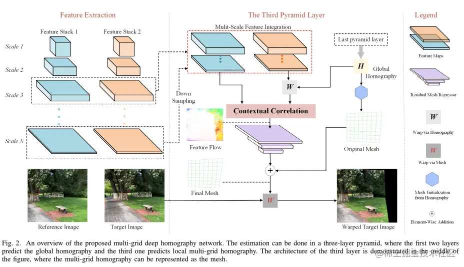 我们采用一系列具有共享权重的卷积池块来提取不同尺度的输入图像的深度特征(, k = 1, 2, ..., N)。然后我们对这些不同尺度的特征进行resize和堆叠,形成一个特征金字塔,其中第l层整合了从尺度l到尺度N的多尺度特征。接下来,我们使用特征金字塔的顶部(l = 1 , 2, 3) 从集成的多尺度特征中预测多网格单应性。在我们的设计中,第 l 层将第 (l-1) 层的预测单应性作为当前层的已知先验信息,并预测残差单应性。具体来说,前两个金字塔层预测全局单应性,而第三个金字塔层预测 U × V 多网格单应性。通过这种方式,我们预测从全局到局部的多网格单应性,使我们的网络能够处理具有视差的图像。