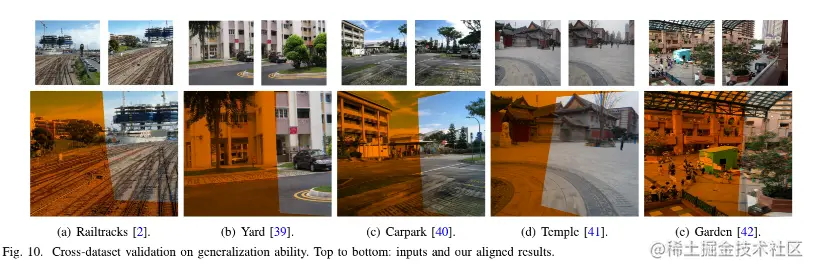 对于大多数深度学习方法来说,泛化是一个缺陷。在本节中,我们验证了所提出方法跨数据集的泛化能力。具体来说,我们在 UDIS-D 中训练我们的网络并在其他数据集中对其进行测试。我们从经典的图像拼接论文 [2]、[39]-[42] 中收集数据集,其中这些数据集是从不同的场景中捕获的,并且包含不同程度的视差。结果如图10所示。即使在其他数据集上进行测试,我们的解决方案仍然具有良好的对齐能力。尤其是这些示例中输入图像之间的重叠率非常低,大多数深度学习解决方案在这些场景中可能会失败。