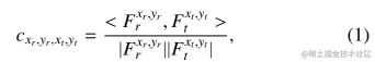 代价体积[25]从 中提取全局相关关系为形状为 的3D体积,用余弦相似度表示相关性如下:
