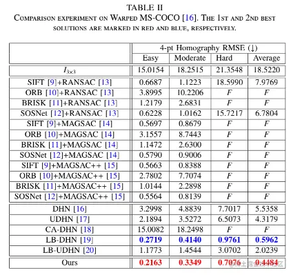 我们首先将我们的方法与传统的基于特征的解决方案进行比较。如表 II 所示,我们选择了各种特征描述符,例如SIFT[9]、ORB [10]、BRISK [11] 和 SOSNet [12],以及不同的异常值拒绝算法,例如RANSAC [13]、MAGSAC [14]、MAGSAC++ [15],组成 12 种不同的解决方案。在这些特征描述符中,采用 SOSNet 将 SIFT 的局部描述符替换为深度学习特征。