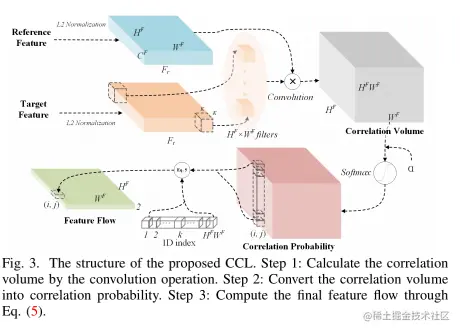 现有的深度单应性解决方案在重叠率较低的场景中效果不佳,因为卷积层无法有效地探索远程相关性。为了解决这个问题,Nie 等人[19] 将代价量引入网络以显式增强特征匹配能力。然而,代价量的应用显着增加了空间和时间成本。为了缓解这个问题,我们提出了 CCL,其结构如图 3 所示。它以 的特征图作为输入并输出密集的特征流。我们将特征流定义为包含垂直和水平运动的特征对应的运动。
