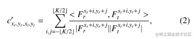 与计算点对点相关性的成本体积相比,我们在这一步计算任意 K × K 区域之间的补丁对补丁相关性。如图 3 顶部所示,我们首先从 中提取密集块 (K × K),步幅设置为 1。然后我们将这些块堆叠为卷积滤波器,并使用它们对 执行卷积操作。我们将卷积的输出称为相关体积,其形状为 。 该体积中的每个值表示一对任意区域之间的相似性,可以表示为等式(2):