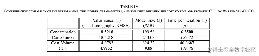 除了图像对齐性能外,我们还将提出的 CCL 与单应性估计领域的成本量进行了比较。CCL 和成本量都是用于在没有学习参数的情况下提取特征对应之间的匹配信息的模块。它们都可以很容易地插入神经网络。