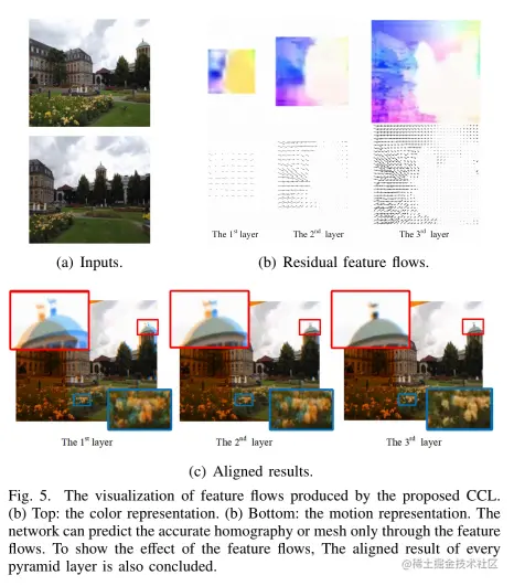 最终,我们得到从参考特征到目标特征的特征流()作为后续回归网络的输入。我们将图 5 中的特征流可视化,其中中间特征流和每个金字塔层中的最终对齐结果成对显示。