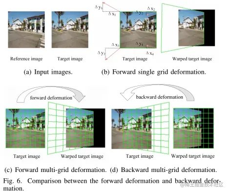 现有的深度单应性解决方案是预测目标图像中4个顶点的8个运动,而不是直接求解单应性中的8个未知参数。通过这 8 个动作,我们可以求解相应的单应性并将目标图像扭曲以与参考图像对齐,如图 6 (a)(b) 所示。我们将这种从目标图像域到参考图像域的运动方向称为前向变形。然后,通过在目标图像上放置一个网格,我们可以将单个网格变形(1×1)扩展到多网格变形(U×V),如图 6(c)所示。与每个像素共享相同单应性的单个网格扭曲不同,多网格扭曲必须为扭曲的目标图像中的每个像素分配不同的单应性。换句话说,在多网格变形中,我们需要弄清楚变形后的目标图像中的像素属于哪个网格。由于扭曲目标图像中的网格形状在前向变形后是不规则的,因此在深度学习实现中很难使用快速有效的方式获得扭曲目标图像中每个网格和每个像素之间的对应关系。因此,如果继续采用前向变形,可以大幅度降低速度。