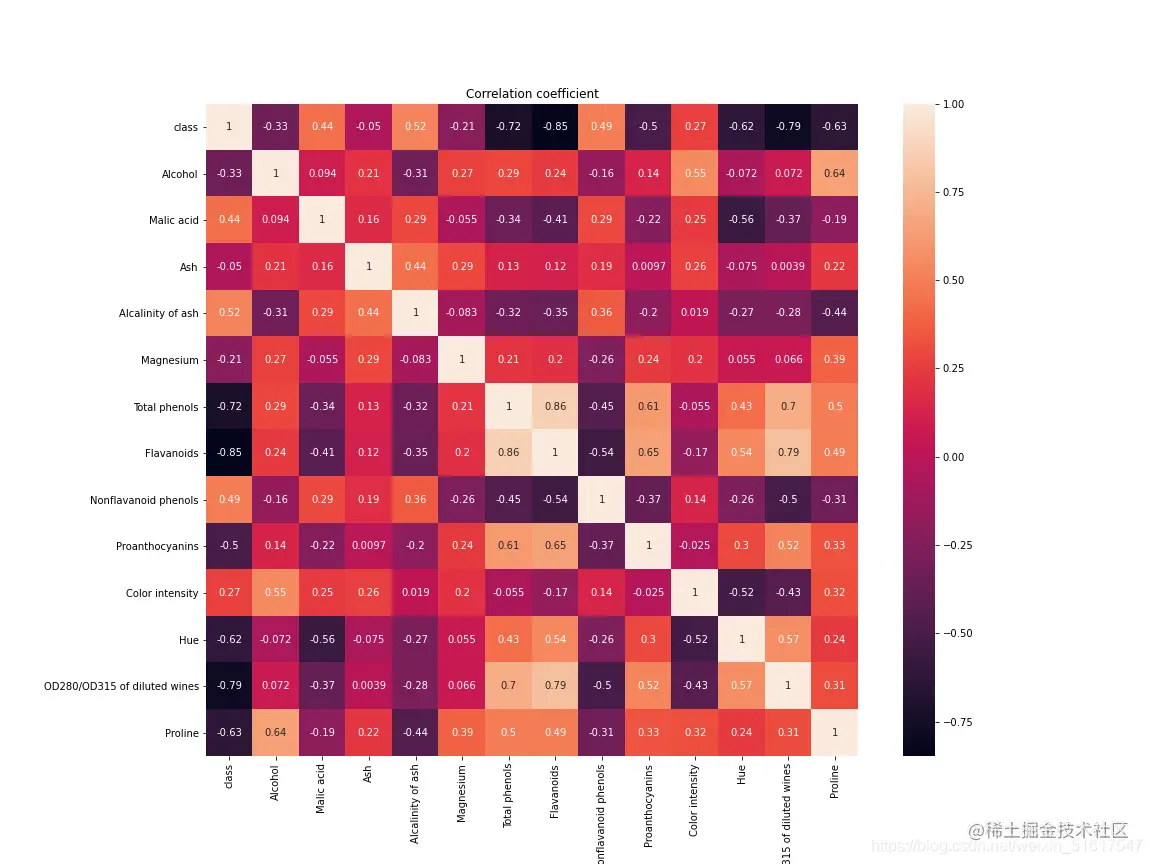以sklearn库中的wine数据集(笔者使用时已将数据集导入到了csv文件中)为例,计算该数据集各变量(特征)之间的相关系数。