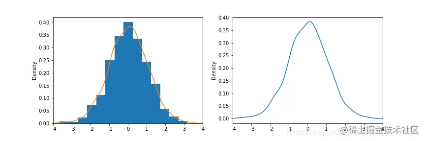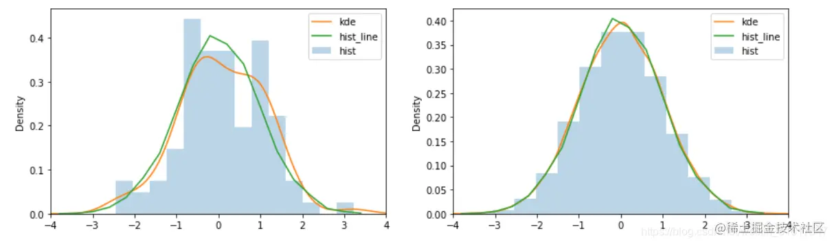 使用python绘出一个正态分布数值集的密度图和直方图的情况,可清晰的看出核密度图与直方图之间的关系,而当数据量越大时,核密度图和直方图平滑得到的曲线越相似。