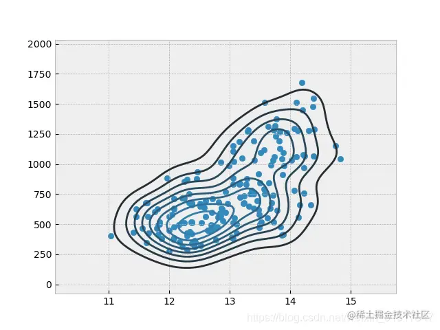 上图在散点图上绘制了一个等势线图(二维密度图),可视化了两个数值型变量之间的关系,等势线在本质上就是两个变量的地形图,每条等势线表示特定的密度值,并随着接近“顶峰”而增大。