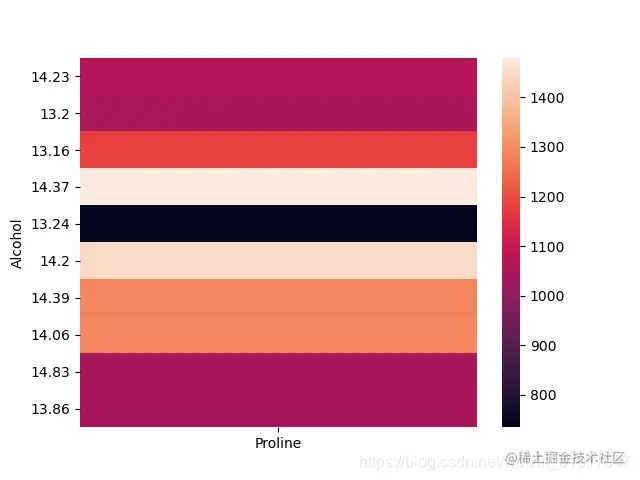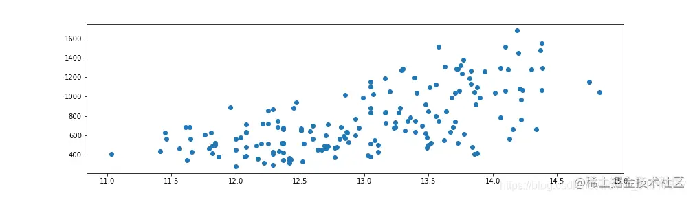 再以wine数据集中Alcohol与Proline两列为例绘出散点图。