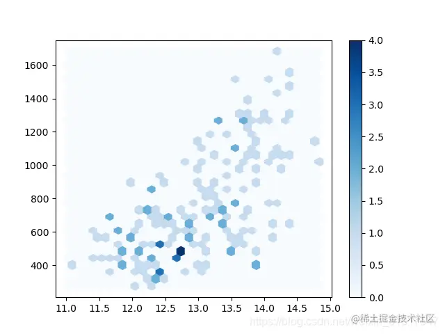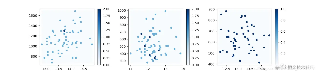 六边形图绘制的并非数据点,而是将记录(样本)分组为六边形的组距,并用不同的颜色绘制各个六边形,以显示每组中的记录数。