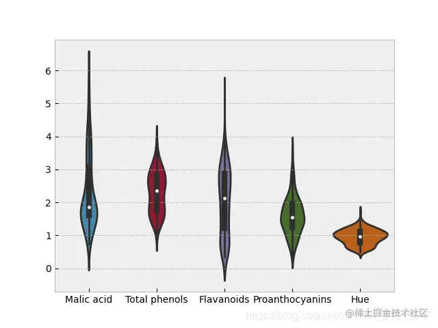 小提琴图是箱形图的一种增强表示,它以y轴为密度来绘制密度估计量的情况。绘图中对密度做镜像并反转(即核密度函数),并填充所生成的形状,由此生成了一个类似小提琴的图形。