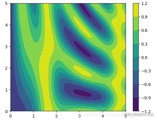 接下来,我们使用plt.contourf()来创建填充的等高线图,它的语法与plt.contour()是一样的。另外我们可以使用plt.colorbar()来创建一个表示图形各种颜色对应标签信息的颜色条。