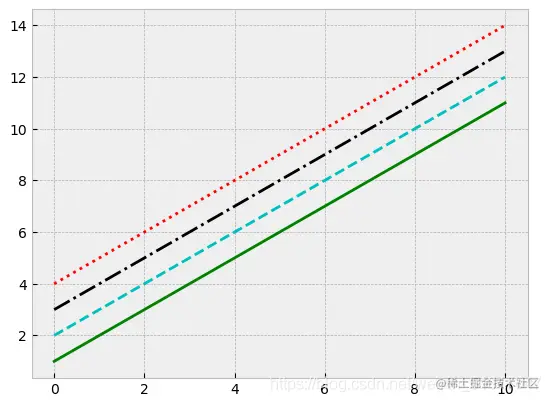 也可以将linestyle和color参数组合起来,用更简洁的表示方式绘图