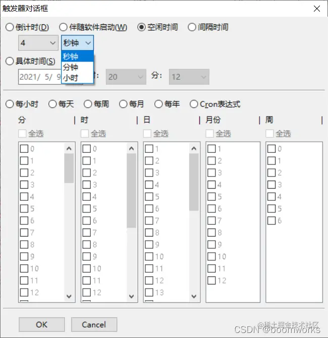 - [注] 前 4 种触发方式,可以指定小时、分钟、秒种,可以精确执行”秒“级的任务。