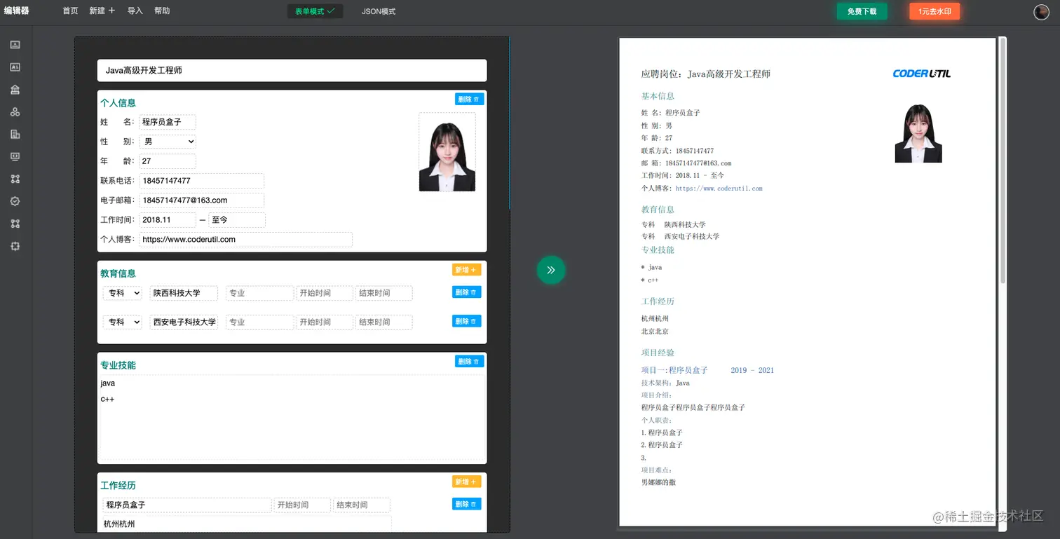 程序员盒子已经上线一年的时间了,作者最近也在思考我们接下来应该推出哪些针对对用户有帮助的服务,程序员人群还有哪些痛点的问题,后来决定做一个在线制作简历的平台,原因:很多人不知道简历该从哪些方面去写;简历内容应该突出哪些内容;找不到合适的模板,找到后模板收费都很贵;最主要的出发点是市面上的模板作者是在是不喜欢,多数都太多花里胡哨,包括自己之前做简历都是word文档个从空白页开始写的。基于这几点原因是希望可以把我从空白模板编写简历的这个耗时耗力的过程进行产品化、线上化,所以就有了现在的:程序员智能简历平台;