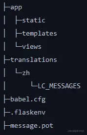 与此同时,通过BABEL_DEFAULT_LOCALE以及BABEL_TRANSLATION_DIRECTORIES分别来配置默认语言以及默认翻译文件存储路径,如果不配置翻译文件默认存储位置,flask-babel默认会去app/translations目录下查找,这与我们翻译文件的路径是不一样。