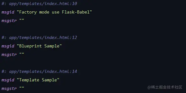 上述命令会根据上一个步骤中生成的模板文件生成对应语言的翻译文件,在translations/zh/LC_MESSAGES目录中可以看到message.po文件,文件内容与message.pot文件内容一直,我们只需要在msgstr字段中填入对应语言的翻译内容即可,如下代码所示
