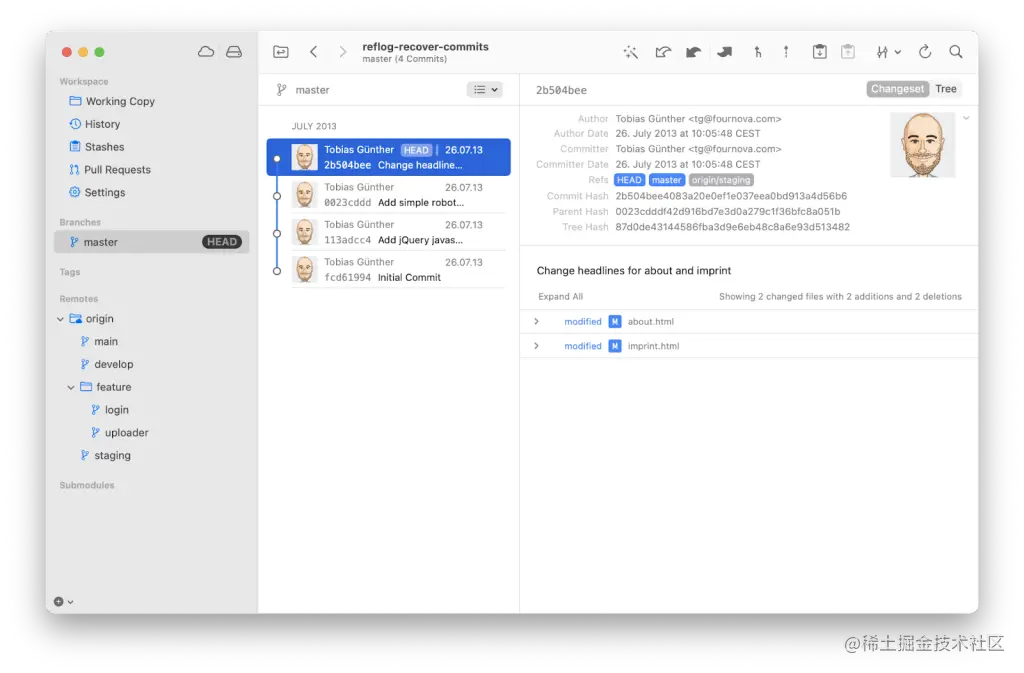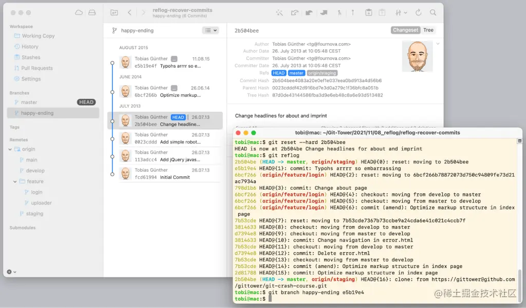 Git的Reflog可以成为真正的救星!如你所见,很容易将丢失的提交甚至整个分支从坟墓中带回来,只需要在reflog中找到正确的哈希ID,其他都是小菜一碟。