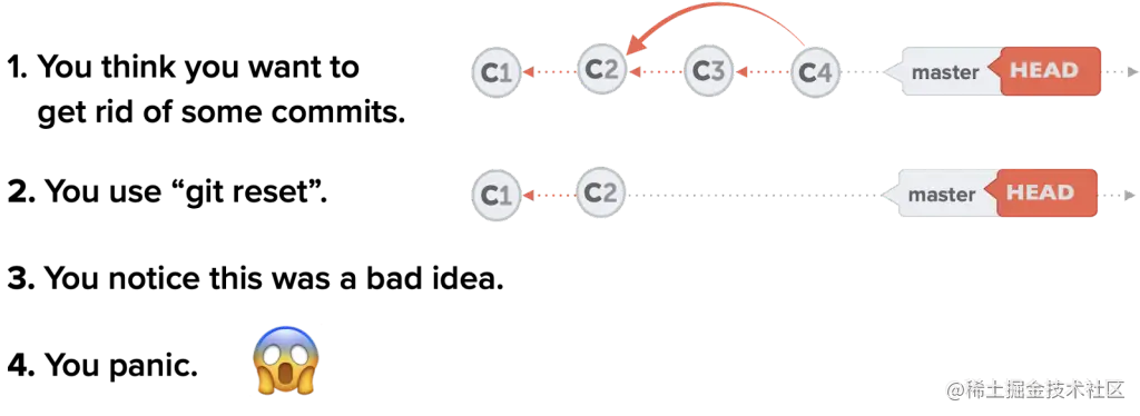 想象一下下面这个场景: 在查看了提交历史之后,我们决定删除最后两次提交。勇敢的执行了一次git reset后,两个提交从提交历史中消失了……过了一会儿,我们发现犯了个错误,我们丢失了有价值的更改,完蛋了!