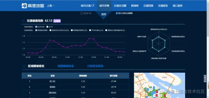 内容:查询区域/商圈拥堵排名、道路状况数据以及季度指数等,有交通报告、交通热力图等