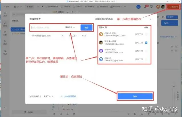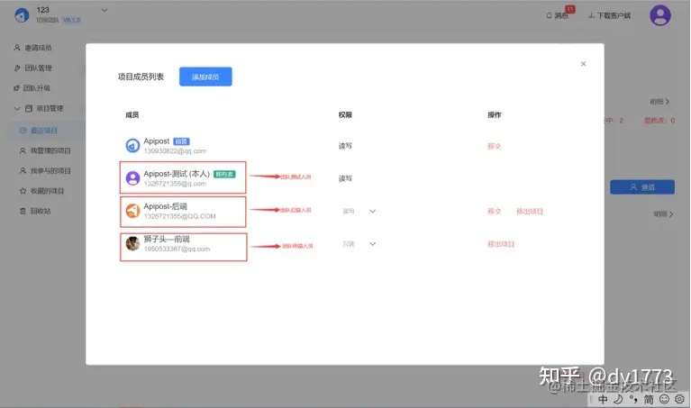在Apipost最新6.0版本中,如果你想邀请团队内成员加入你的项目,只需一秒就可以完成,选择团队成员点击添加,若成员不在团队内,直接输入想邀请人的账号,即可加入。