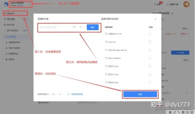 在个人管理中心,点击【邀请成员】即可邀请成员进入团队中,同时可以根据需求选择进入不同项目中。
