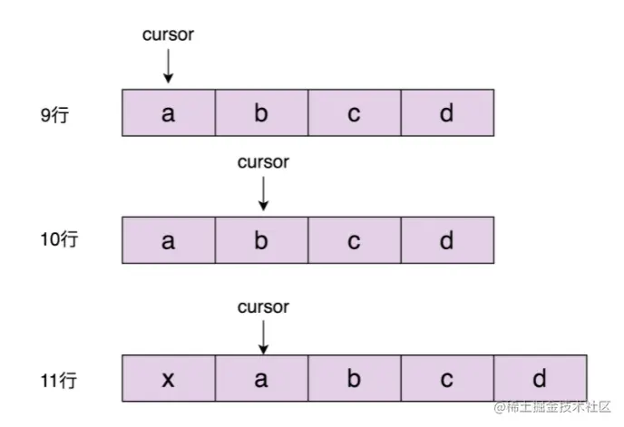 - 在执行完第 10 行代码之后,数组中包含 a、b、c、d 四个元素,游标指向 b 这个元素,已经跳过了元素 a。在执行完第 11 行代码之后,我们将 x 插入到下标为 0 的位置,a、b、c、d 四个元素依次往后移动一位。这个时候,游标又重新指向了元素 a。元素 a 被游标重复指向两次,也就是说,元素 a 存在被重复遍历的情况。