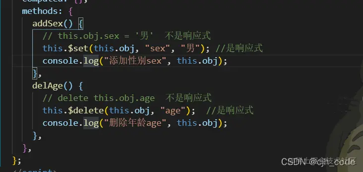 //this.$delete(this.obj, "age"); //是响应式