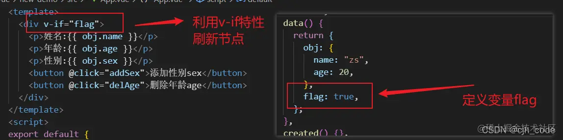语法: - vm.$set("被设置的对象" , "属性/索引" , "值")- vm.$delete("被设置的对象" , "属性/索引") 下面看看直接添加、删除对象属性(代码仅供测试,可忽略)