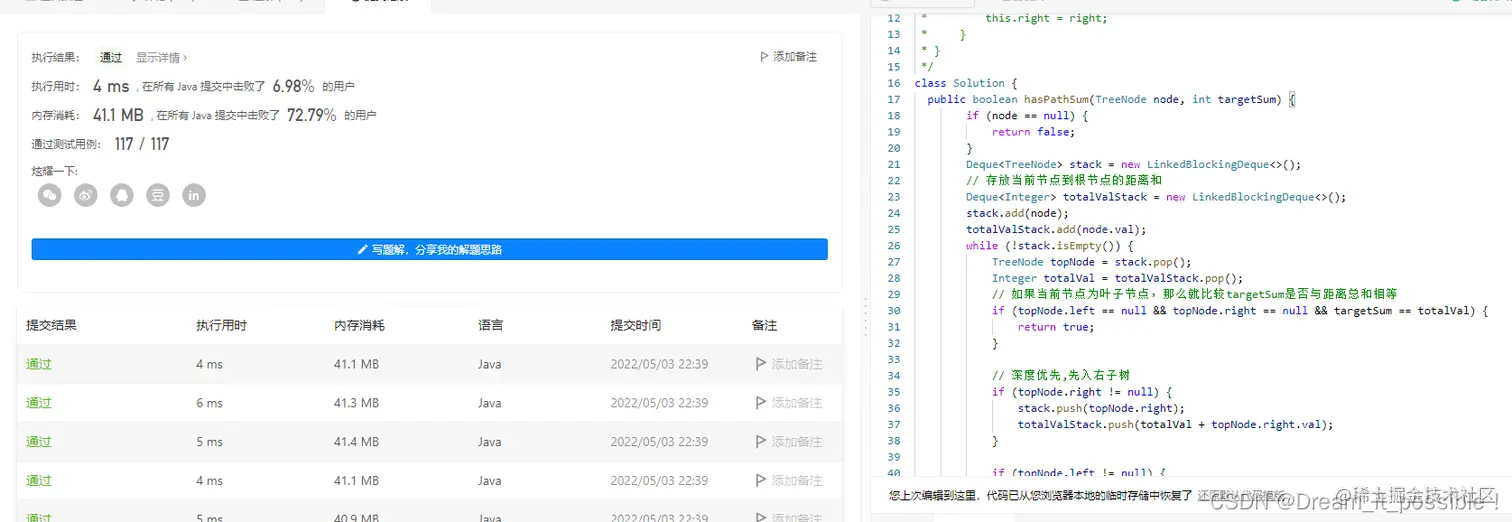 根据题意,我们要求的每个叶子节点到根节点的总路径,因此我们可以在遍历每个节点时想办法记录下每个节点到根节点的距离,如果遍历到叶子节点,那么就比较当前节点到根节点的距离和是否等于target,如果等于那么返回true,如果遍历完了整个树叶没有返回true,那么表示没有找到一条叶子节点到根节点的路径和为target。