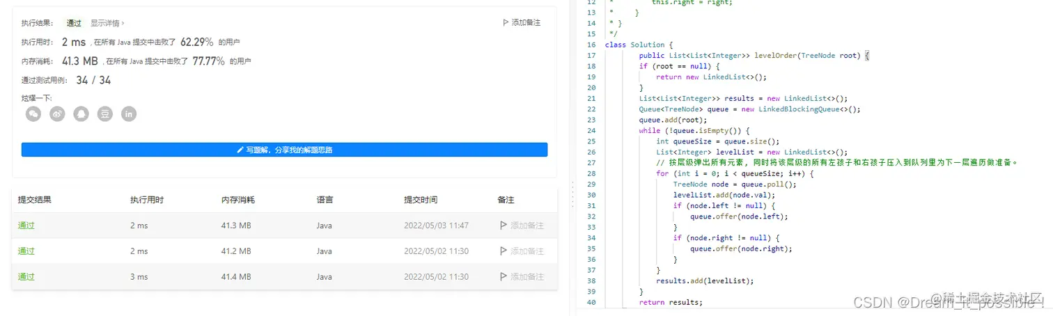 实现思路: 我们可以基于广度优先遍历算法,通过queue的size按层分割,然后按层级弹出所有元素形成一个列表, 同时将该层级的所有左孩子和右孩子压入到队列里为下一层遍历做准备。