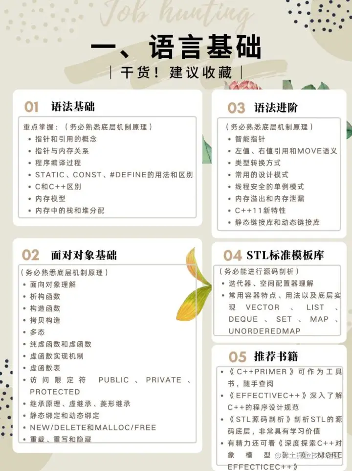 如何系统地学习 C++ 语言? 飞援 2022-05-04 214 阅读1分钟 网上看到了一份关于C++的学习路线,分享给大家,侵删。 关于飞援 飞援是一个新兴的程序员接单平台。平台会居中主导匹配甲方需求和合适的开发者,不用自己在甲方面前和其他程序员竞标PK。所以如果工作质量比较稳定,并且时间也比较宽裕,持续合作会源源不断的有单子。