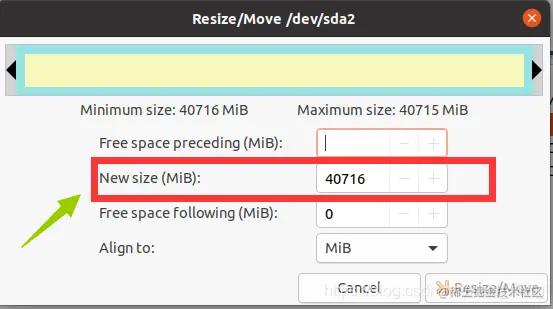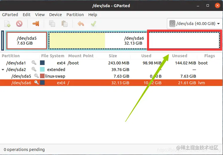 1. 在第一步操作完之后,打开gparted可以看到如图所示红框部分应该有一段灰色区域表示未分配空间