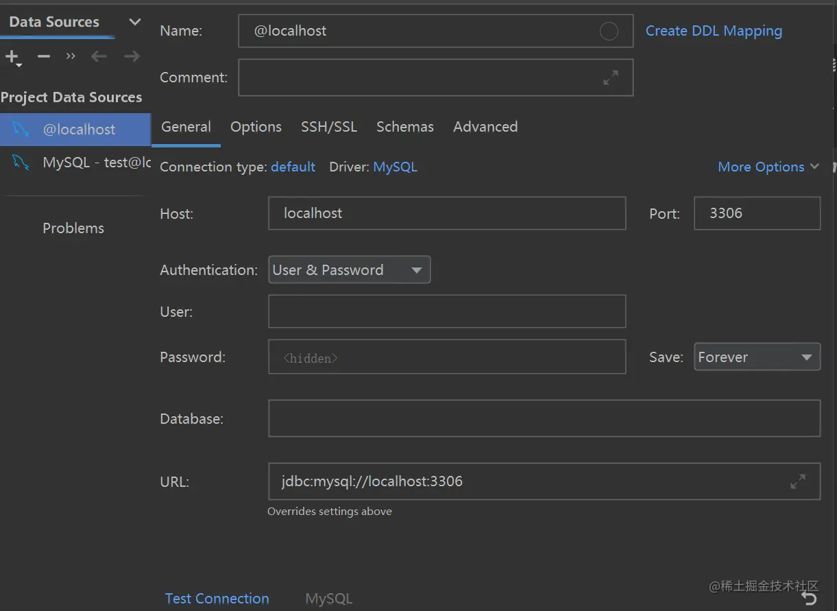 在IDEA右侧找到database卡片,选择添加mysql数据源,配置以下信息,完成Mysql连接。