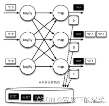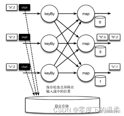 如下图所示:位于检查点之前的所有记录(["b",2]、 ["b",3] 和 ["c",1])被 map 算子处理之后的情况。此时,稳定存储已经备份了检查点屏障在输入流中的位置(备份操作发生在检查点屏障被输入算子处理的时候)。map 算子接着开始处理检查点屏障,并触发将状态异步备份到稳定存储中这个动作。检查点屏障像普通记录一样在算子之间流动。当 map 算子处理完前 3 条记录并收到检查点屏障时,它们会将状态以异步的方式写入稳定存储。