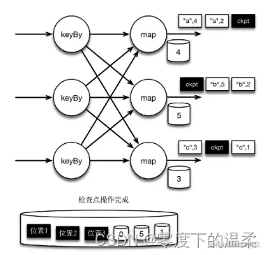 当 map 算子的状态备份和检查点屏障的位置备份被确认之后,该检查点操作就可以被标记为完成,如下图所示。我们在无须停止或者阻断计算的条件下,在一个逻辑时间点(对应检查点屏障在输入流中的位置)为计算状态拍了快照。通过确保备份的状态和位置指向同一个逻辑时间点,从而保证 exactly-once。值得注意的是,当没有出现故障时, Flink 检查点的开销极小,检查点操作的速度由稳定存储的可用带宽决定。值得注意的是,备份的状态值与实际的状态值是不同的。备份反映的是检查点的状态