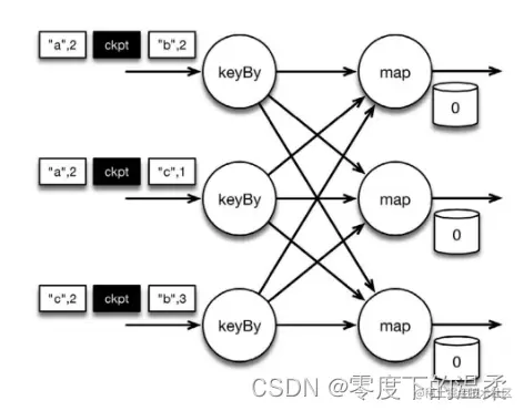 上图表示程序的初始状态:输入流中的6条记录被检查点屏障(checkpoint barrier)隔开,所有的 map 算子状态均为0(计数还未开始)。所有 key 为 a 的记录将被顶层的 map 算子处理,所有 key 为 b 的记录将被中间层的 map 算子处理,所有 key 为 c 的记录则将被底层的 map 算子处理。其中 ["b",2] 在检查点之前被处理, ["a",2] 则在检查点之后被处理