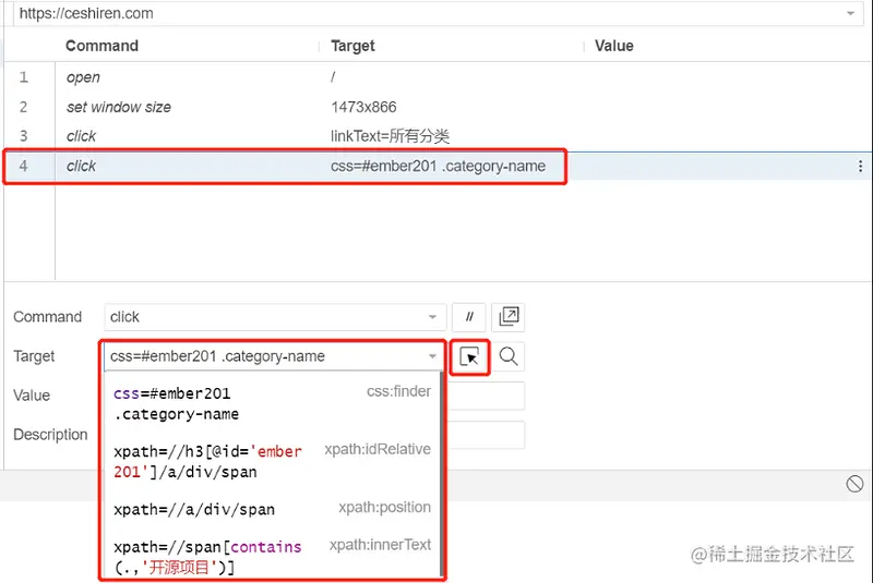 如果想定位其他的控件,只需要点击图中的箭头,点击后就会跳转到浏览器,然后点击想要定位的控件,Target 的值就会出现相应的定位表达式。