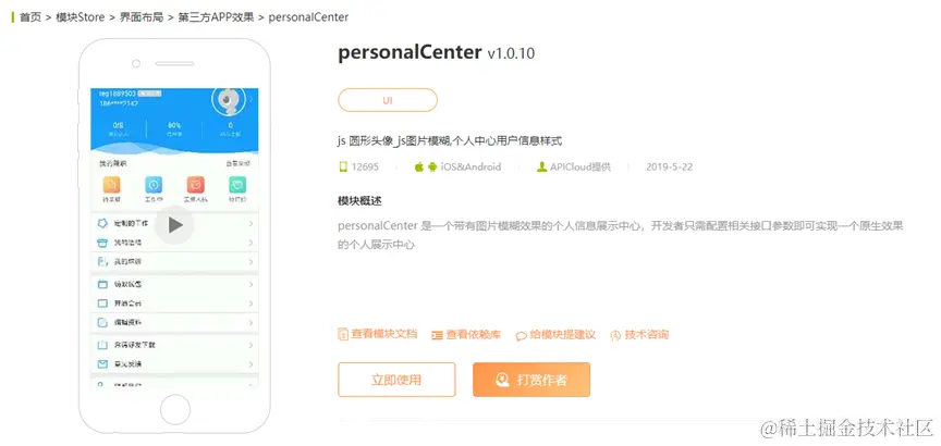 这篇文章使用了一个简单的免费模块PersonalCenter,首先我们打开APICloud官网的控制台创建一个项目,创建项目的方法相信大家都已经熟悉了,这里就不再赘述。创建好项目之后,点击上方导航栏的模块Store,然后搜索个人信息,之后就看到了PersonalCenter模块。点进去之后再点立即使用,然后选择自己的应用就好了,一定要选择自己现在要开发的项目,不要选错哦。