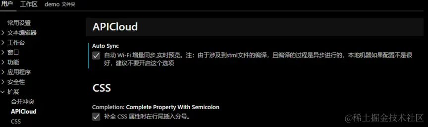 把下载好的自定义Loader拖入逍遥模拟器安装好,打开我们的开发工具APICloud Studio3,把项目用WIFI同步到模拟器后,我们进行一个设置,点击开发工具左下角的齿轮,然后点击设置,在设置界面里点击扩展。然后勾选Auto Sync这个选项,这样我们每次保存后,项目就会自动同步到模拟器中,更改完代码后不用再每次都手动的进行同步了,非常方便的小功能。