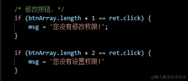 这段代码的意思是当我们点击按钮后的返回值如果是btnArray这个数组的长度+1,那么就提示您没有修改权限。如果点击按钮后的返回值如果是btnArray这个数组的长度+2,那么就提示您没有设置权限。