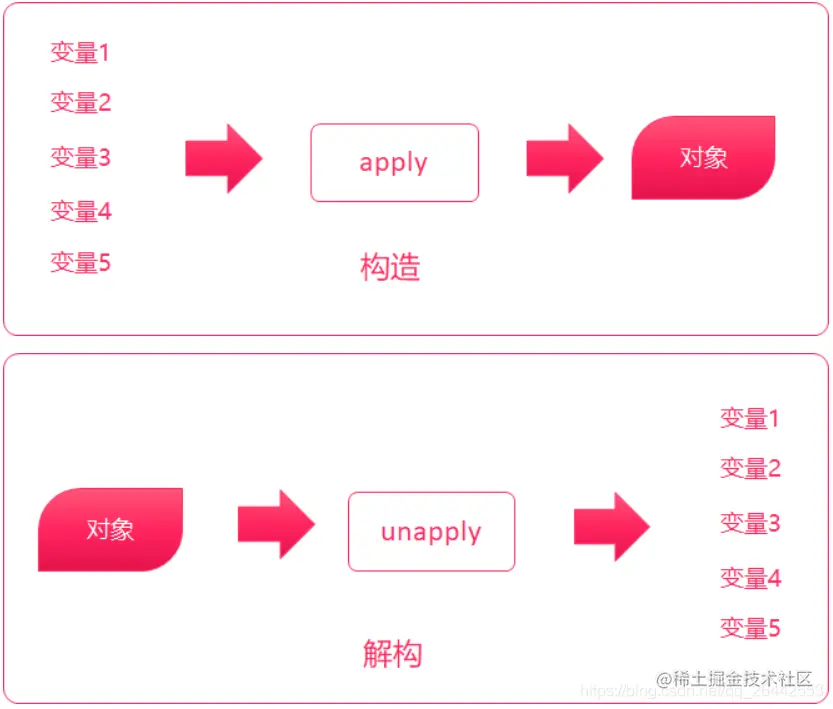 之前我们学习过了,实现一个类的伴生对象中的apply方法,可以用类名来快速构建一个对象。伴生对象中,还有一个unapply方法。与apply相反,unapply是将该类的对象,拆解为一个个的元素。