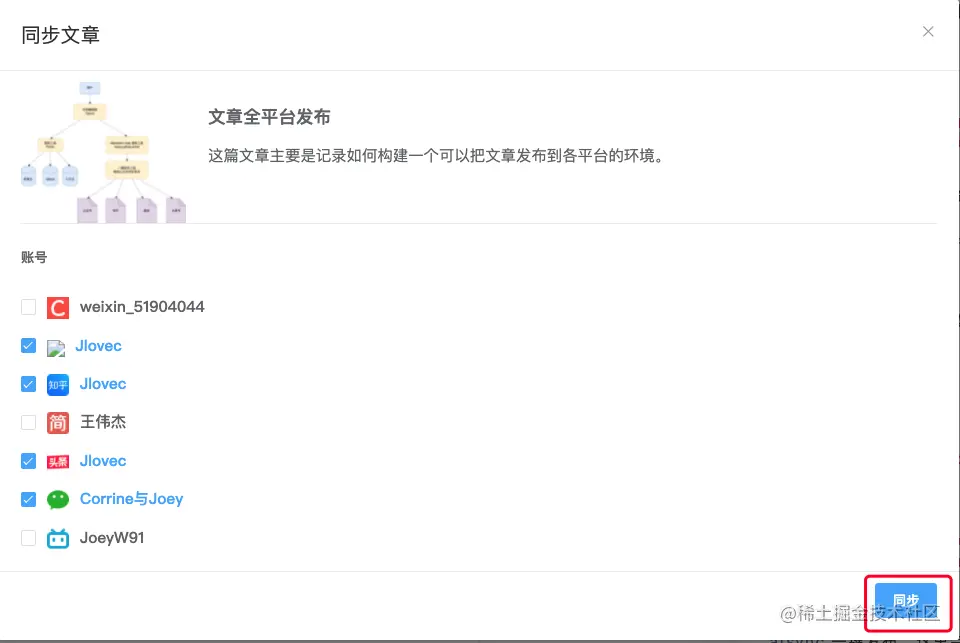 选择要发布的平台同步文章,Wechatsync 需要先 Chrome 中登录过对应的平台,才能选择同步到该平台