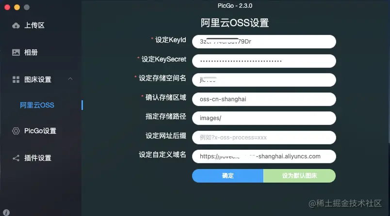 点击PicGo的打开详细窗口,进行图床配置,此处配置为阿里云 OSS,需要设置仓库名:KeyId、KeySecret、存储空间名、存储区域 4 个必要参数。