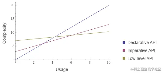 在设计新的库时,斜率截距评估真的很有意义。它可以作为一个框架来讨论你在前面加载给用户的复杂度,以及在持续使用一个库的过程中分摊的复杂度。