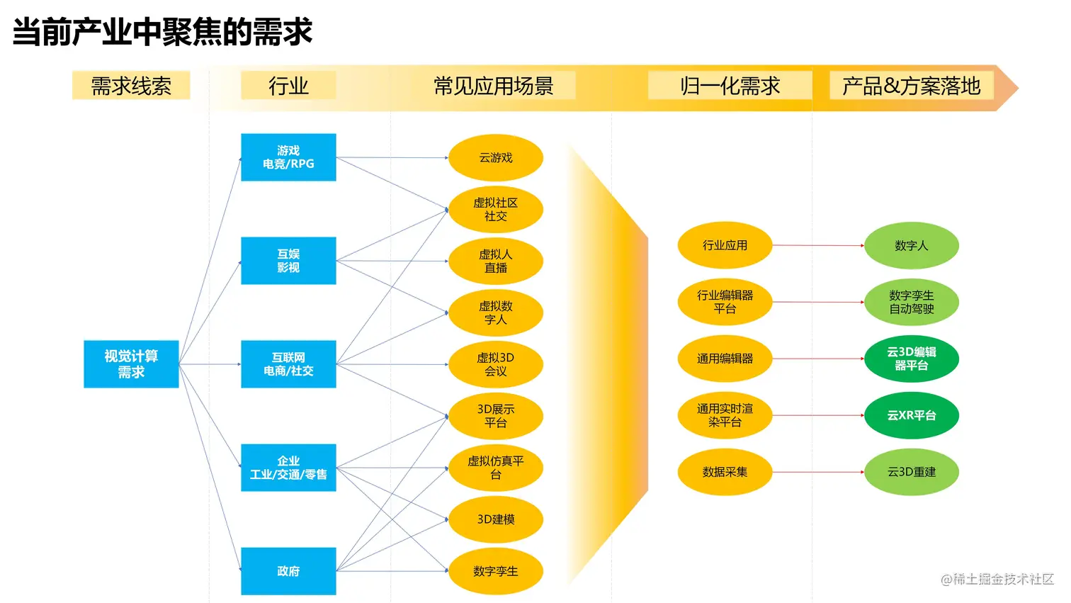 我们再聚焦到产业看需求。上图中有一个常见的应用场景,在媒体上这个经常与我们理解的XR及各类Verse概念是绑在一起的,而对以上场景目前的认知也还在视觉计算的范畴,这些场景来自于不同行业,帮助行业创造新的业务需求或者做生产力优化。虽然这些场景目前看上去极为复杂,但是当我们站在视觉计算的角度对以上场景做归一化时,最终仍然会落到我们已经定义好的产品能力板块上了。