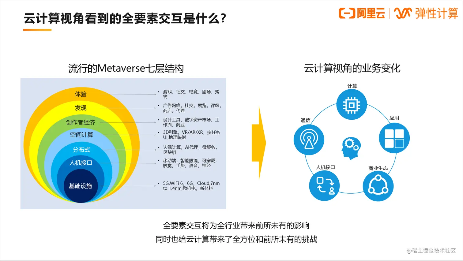我们借助网上非常流行的“‘Metaverse’产业七层体系图”说明产业体系,顺便也看云计算要在其中承载的社会价值。可以看到图中是从最接近C端用户的体验场景需求,一直延伸到产业的最顶端尖端基础设施技术的需求,相比于过去每一次信息产业的变革,这次尤为复杂。从图中我们也能体会到,XR及各类Verse是利用人类已有和将有的技术加之商业手段实现对人类感官体验进行全方位升级,并且通过这次的升级浪潮实现全行业创造力和生产力的一次重大飞跃。