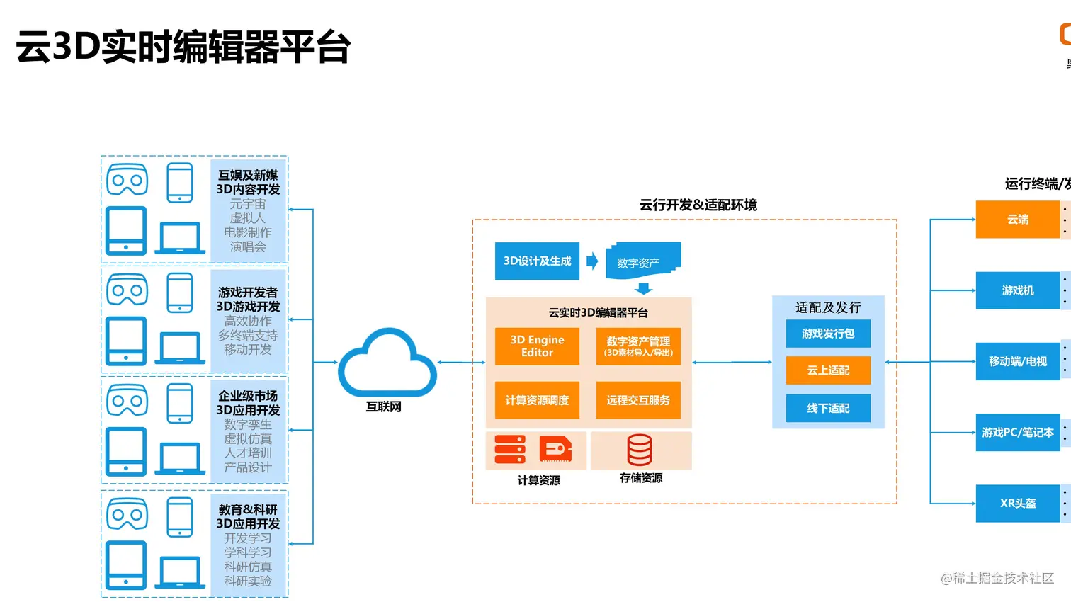 ◾ 通用层:通用层是提供更加原子化的能力来帮助全行业在云上构建业务,比如:云XR平台和云3D编辑器就是这一层面的关键产品。