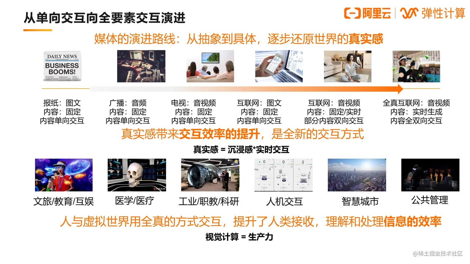 2019年阿里云北京峰会上,阿里云与我们一个重要合作伙伴一同发布了一款新的图形GPU计算实例vGN6i,演示的场景是模拟一位购车用户通过支付宝小程序接入到一个逼真的汽车试驾3D空间,这个3D汽车和驾驶空间位于云上,购车用户在平板电脑上完成了这次试驾体验。这也是阿里云弹性计算业务最早接触数字孪生客户场景。合作过程中我们也逐步意识到数字孪生是提升全社会创造力和生产力的关键技术,之后我们便非常明确地加大了针对图像和流媒体相关产品与技术的投入和积累。于是,时间到了2021年,此时“VR/AR/MR”这些概念再次流行起来,甚至变得炙手可热,业界已经创造出了各类“Verse”来描述概念,但是在我们看来目前依然处在XR的视觉计算阶段。