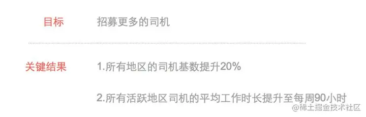 在这个例子中,目标的时限要求是用OKR周期来限制,这个目标是简洁的(只有7个字)、定性的(没有出现数字)、时限要求(本季度内可以完成)、鼓舞人心的(招募更多司机)。而关键结果则需要准确回答目标中“什么叫更多”这个问题,这里确定的是“所有地区的司机基数提升20%”和“所有活跃地区司机的平均工作时长提升至每周90小时”就算达到了“招募更多的司机”目标。